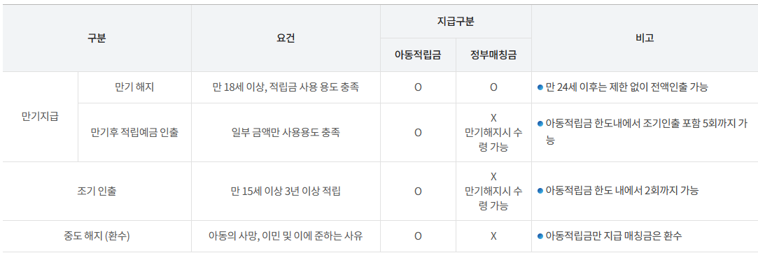 학자금・기술자격취득・주거마련 등 자립사용용도가 발생하지 않은 경우, 만 24세 도달 시 사용 용도 제한 없이 아동 적립금 및 정부 매칭지원금의 지급 가능