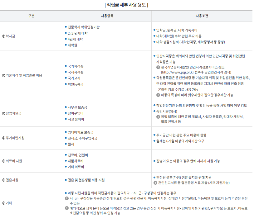 이후 학자금, 기술자격 및 취업훈련비용, 창업지원금, 주거마련 지원 등 자립을 위한 용도에 한하여 사용 가능