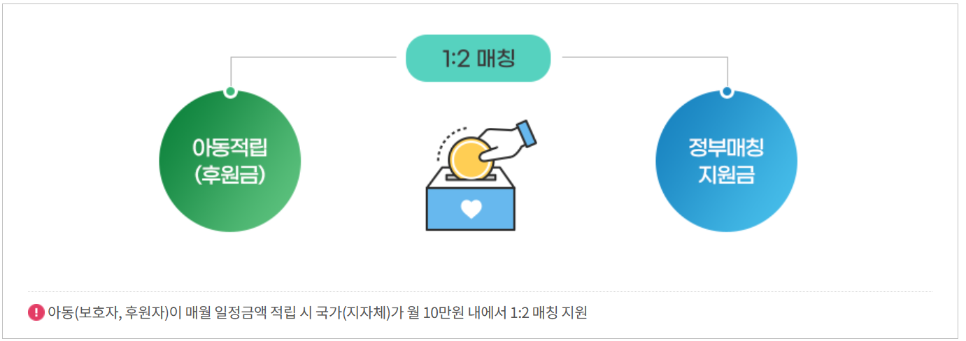 아동이 후원을 받거나 본인이 직접 저축해 통장에 적립하면 정부가 적립 금액의 1:2 비율로 매칭해 월 최대 10만 원까지 지원을 합니다.