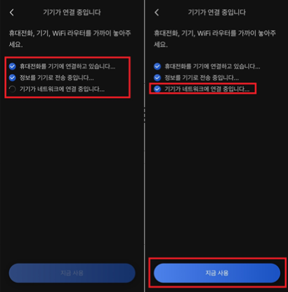여기 화면에서 '기기가 네트워크에 연결 중입니다'까지 완료되면, '지금 사용'버튼을 클릭해 주세요.