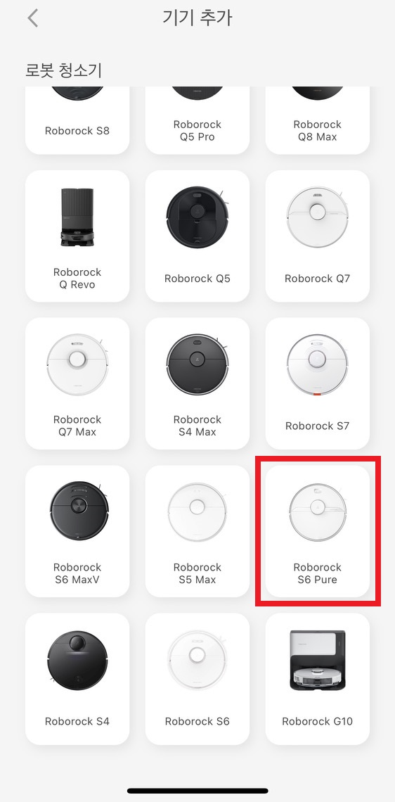 '기기검색'화면에서 로보락 S6 pure(Roborck S6 Pure)를 찾아 클릭해 주세요