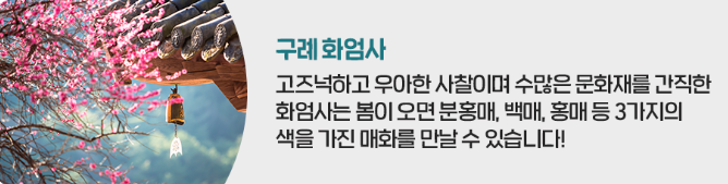 수많은 문화재를 간직한 화엄사는 봄이 오면 분홍매, 백매, 홍매 등 3가지의 색을 가진 매화를 만날 수 있습니다. 고즈넉하고 우아한 사찰을 배경으로 붉은빛의 아름다운 매화와 함께 인생 샷을 남겨보세요.