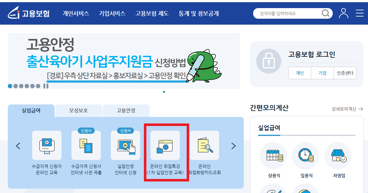 고용보험사이트 접속, 개인으로 로그인 후 "온라인 취업특강" 클릭