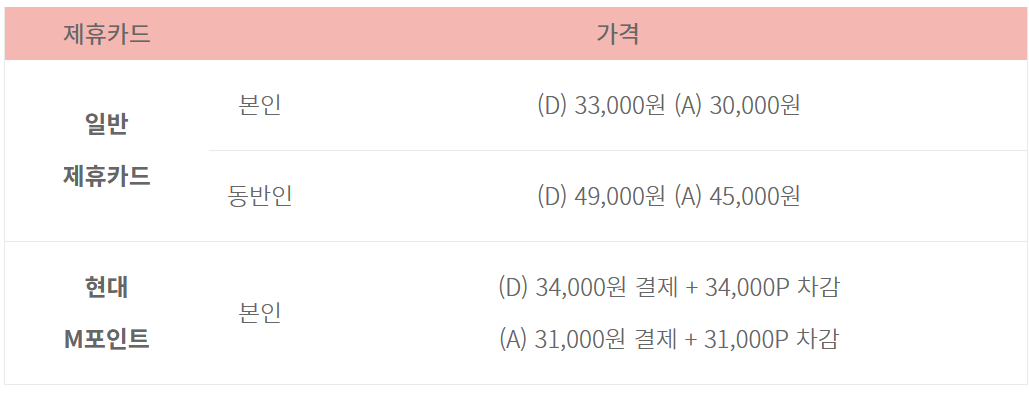 - 제휴카드 우대 가격은 현장 매표 시에만 적용 가능하며, 카드사별 할인율에 따라 최종 결제금액은 상이할 수 있습니다.