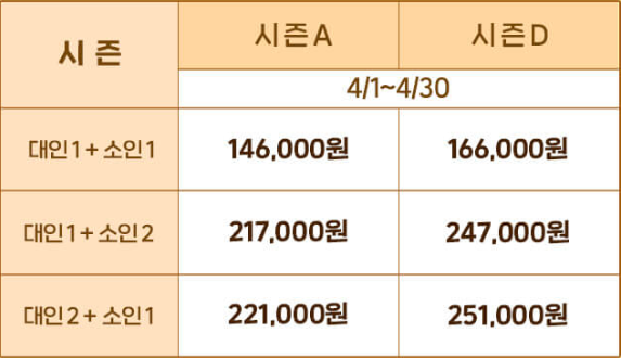 - 가격 : 4월 (D) 39,000원 (A) 35,500원 / 5월 (D) 44,200원 (A) 40,300원