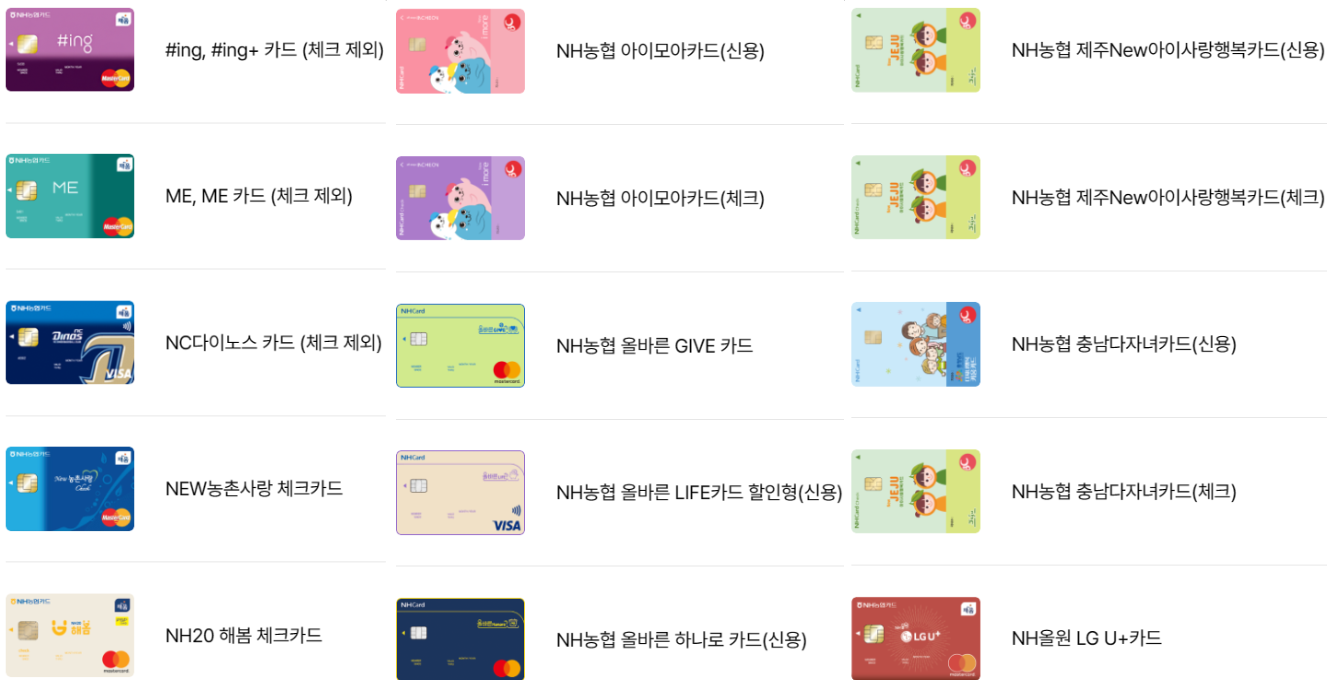 #ing, #ing+카드(체크 제외)/ Me, Me 카드(체크제외)/ NC다이노스 카드(체크제외)/ NEW 농촌사랑 체크카드/ NH20해봄 체크카드/ NH농협 아이모아카드(신용/체크)/ NH농협 올바른 GIVE 카드/ NH농협 올바른 LIFE카드 할인형/ NH농협 올바른 하나로 카드/ NH농협 제주New아이사랑행복카드(체크/신용)/ NH농협 충남다자녀카드(신용/체크)/  NH올인 LG U+카드