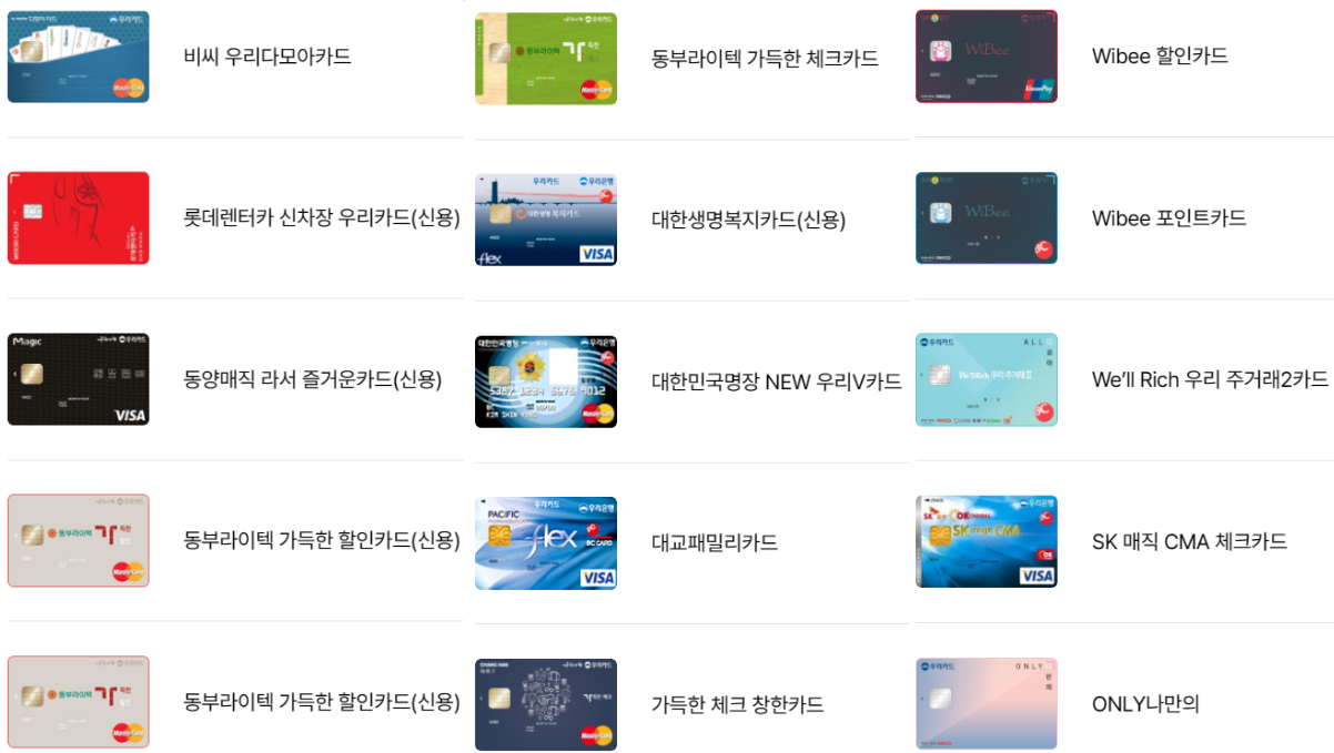 비씨 우리다모아카드/ 롯데렌터카 신차장 우리카드/ 동양매직 라서 즐거운카드/ 동부라이텍 가득한 할인카드/ 동부라이텍 가득한 체크카드/ 대한생명복지카드/ 대한민국명장 NEW 우리V카드/ 대교패밀리카드/ 가득한 체크 창한카드/ Wibee할인카드/ Wibee포인트카드/ We'll Rich 우리 주거래2카드/ SK매직 CMA체크카드/ ONLY나만의
