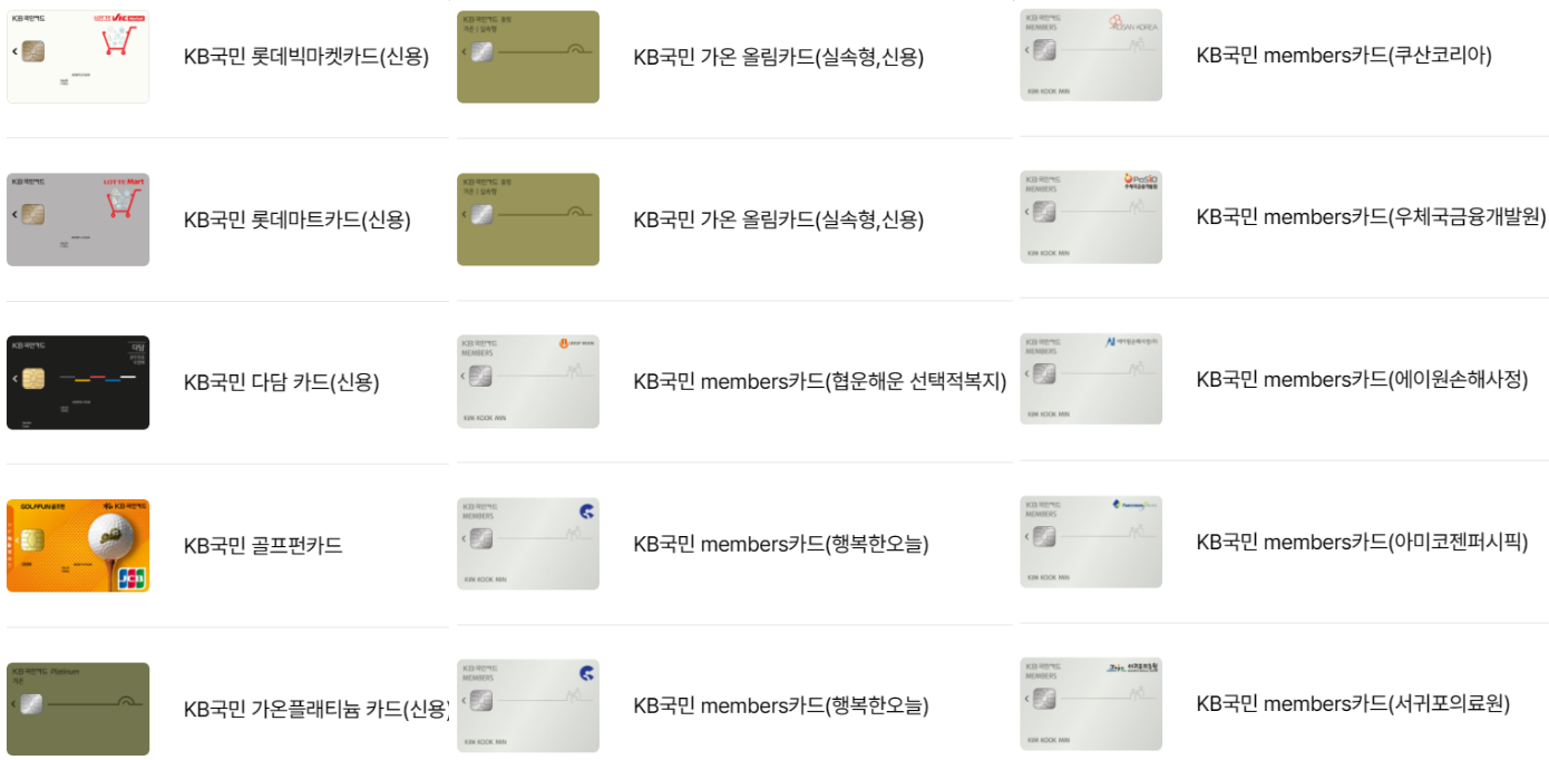 KB국민 롯데빅마켓카드/  KB국민 롯데마트카드/  KB국민 다담 카드/  KB국민 골프펀카드/  KB국민 가온플래티늄 카드/  KB국민 가온 올림카드/  KB국민 가온 올림카드/  KB국민members카드/