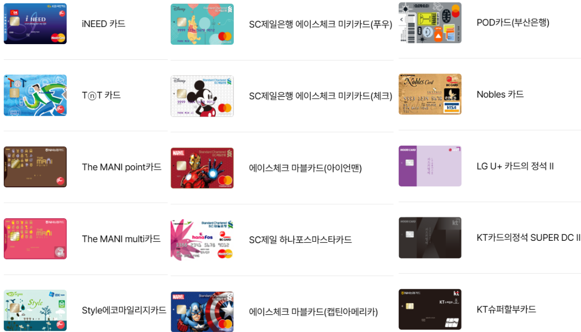 iNEED 카드/ TnT카드/ The MANI point카드/ The MANI multi카드/ Style에코마일리지카드/ SC제일은행 에이스체크 미키카드(푸우)/ SC제일은행 에이스체크 미키카드(체크)/ 에이스체크 마블카드(아이언맨)/ SC제일 하나포스마스타카드/ 에이스체크 마블카드(캡틴아메리카)/ POD카드(부산은행)/ Nobles카드/ LG U+ 카드의 정석 II/ KT카드의정석 SUPER DC II/ KT슈퍼할부카드