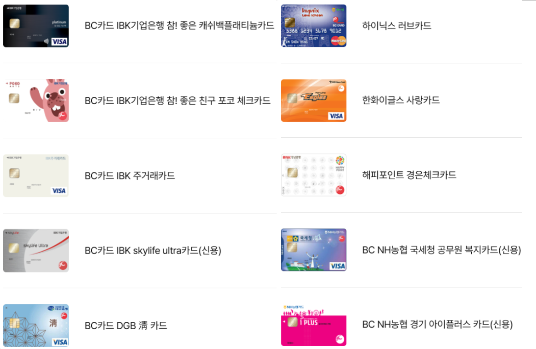 BC카드 IBK기업은행 참 좋은 캐쉬백플래티늄카드/ BC카드IBK기업은행 참 좋은 친구 포코 체크카드/ BC카드 IBC 주거래카드/ BC카드 IBK skylife ultra카드/ BC카드 DGB 淸카드/ 하이닉스 러브카드/ 한화이글스 사랑카드/ 해피포인트 경은체크카드/ BC NH농협 국세청 공무원 복지카드/ BC NH농협 경기 아이플러스 카드