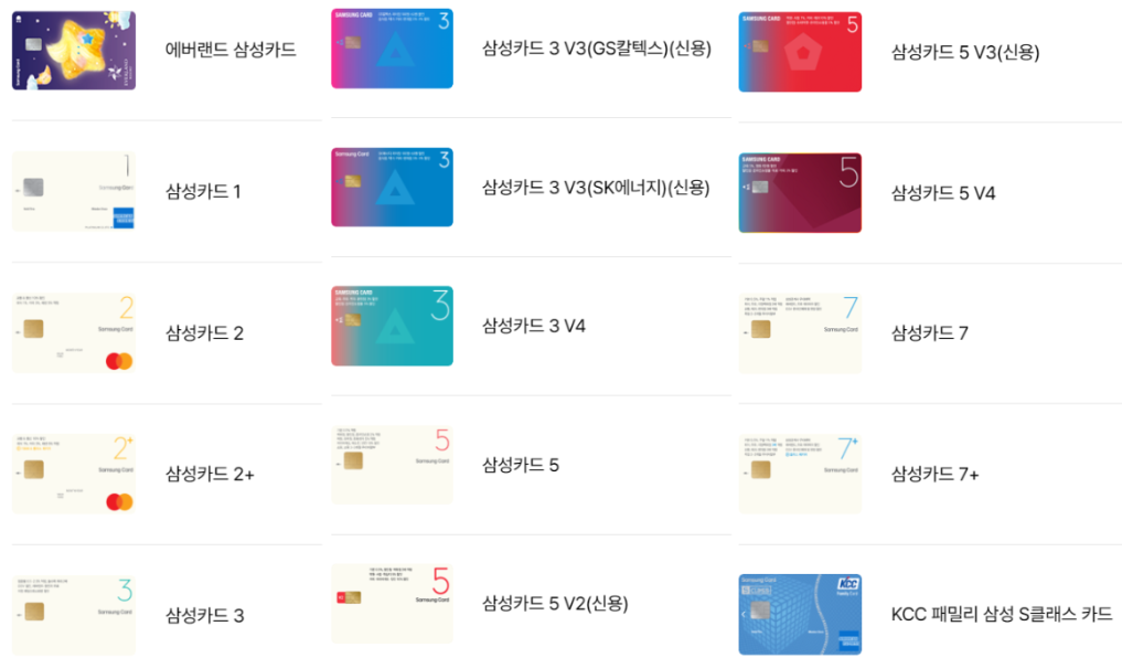 에버랜드 삼성카드/ 삼성카드1/ 삼성카드2/ 삼성카드2+/ 삼성카드3/삼성카드3V3(GS칼텍스)/ 삼성카드3V3(SK에너지)/ 삼성카드3 V4/ 삼성카드5/ 삼성카드V2/ 삼성카드5 V3/ 삼성카드5 V4/ 삼성카드7/ 삼성카드7+/ KCC 패밀리 삼성 S클래스 카드