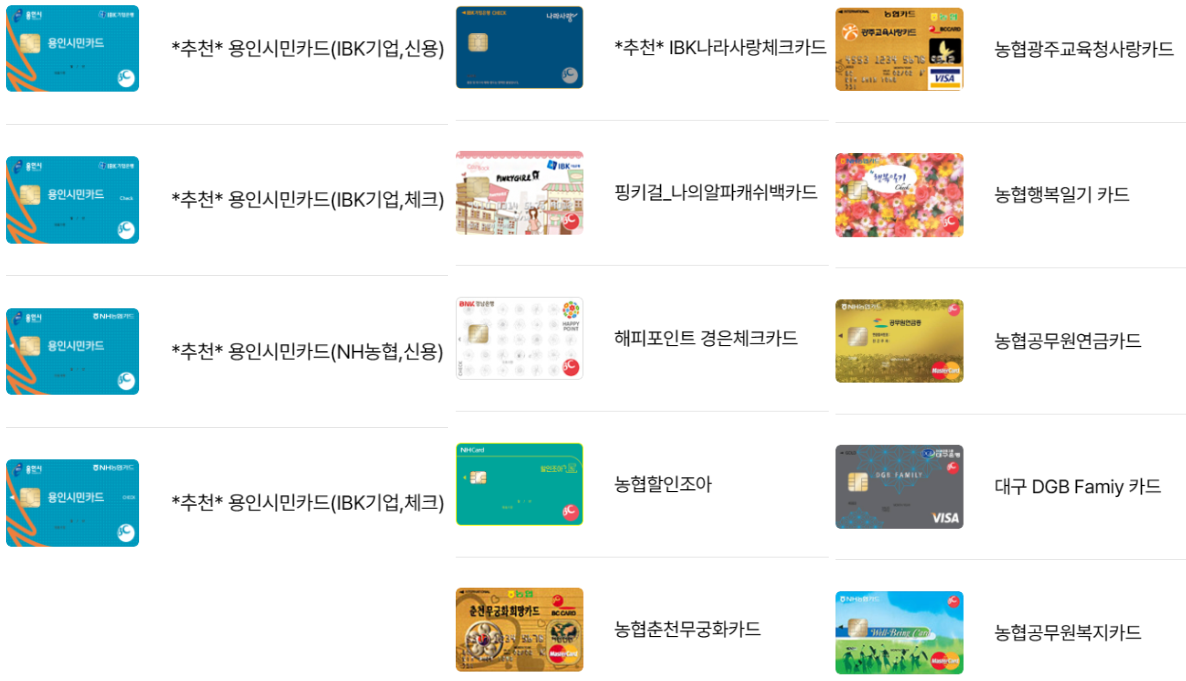 용인시민카드(IBK,신용/체크)/ 용인시민카드(NH농협, 신용/체크)/ IBK나라사랑체크카드/ 핑키걸 나의알파캐쉬백카드/ 해피포인트 경은체크카드/ 농협할인조아/ 농협춘천무궁화카드/ 농협광주교육청사랑카드/ 농협행복일기 카드/ 농협공무원연금카드/ 대구 DGB Family 카드/ 농협공무원복지카드