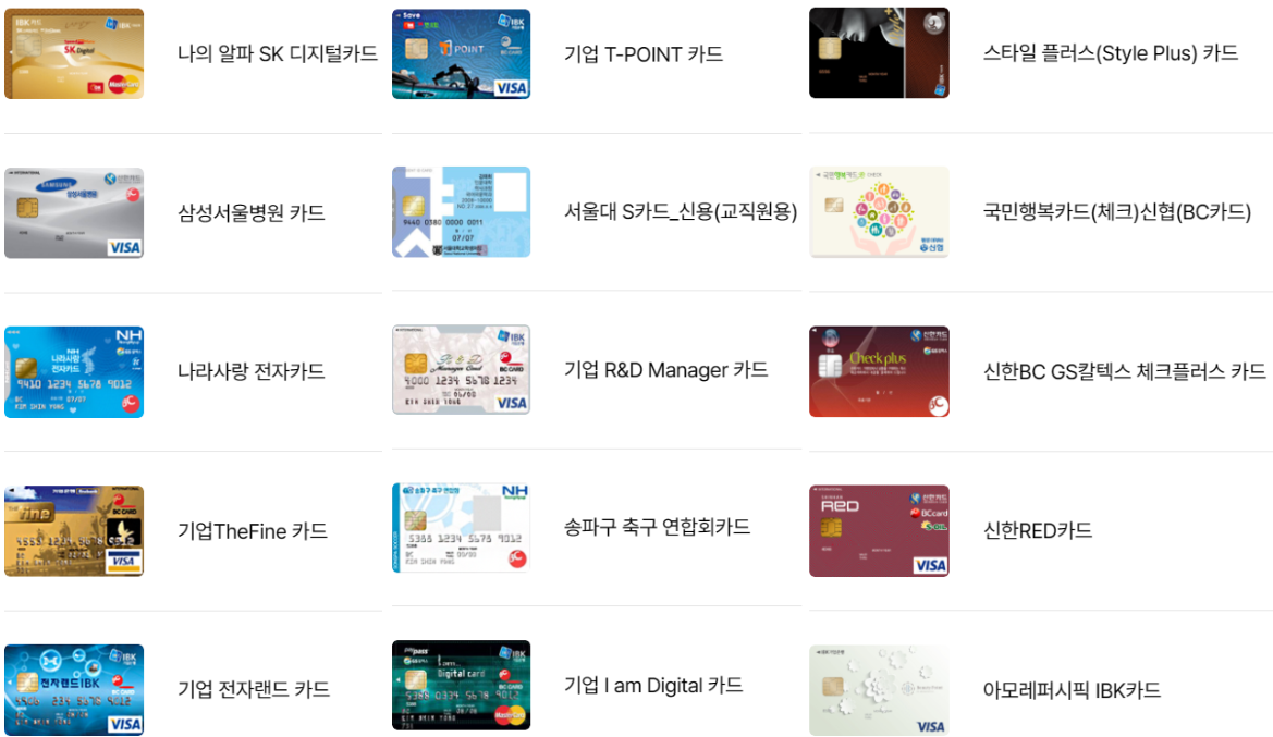 나의 알파 SK디지털카드/ 삼성서울병원 카드/ 나라사랑 전자카드/ 기업TheFine카드/ 기업 전자랜드 카드/ 기업 T-POINT카드/ 서울대 S카드 신용(교직원용)/ 기업 R&D Manager카드/ 송파구 축구 연합회카드/ 기업 I am Digital 카드/ 스타일 플러스 카드/ 국민행복카드신협/ 신한BC GS칼텍스 체크플러스 카드/ 신한RED카드/ 아모레퍼시픽 IBK카드