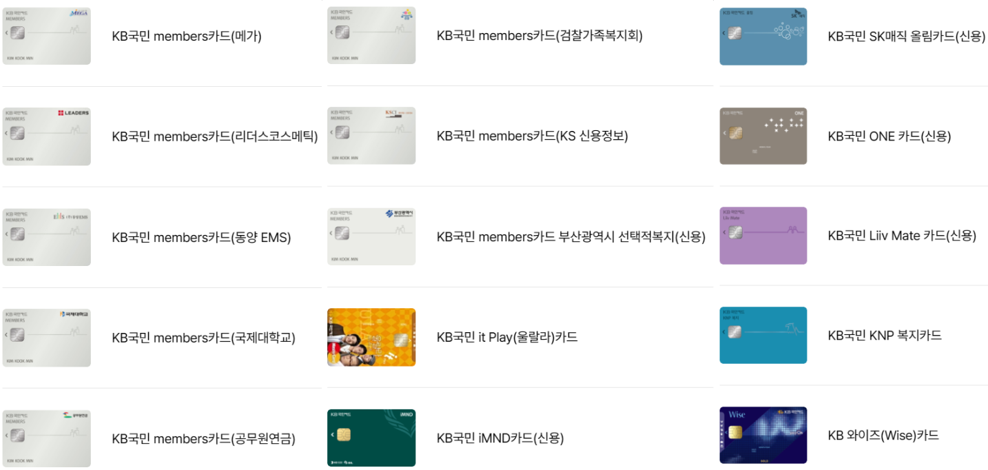KB국민 it play(울랄라)카드/  KB국민 iMND카드/  KB국민SK매직 올림카드/  KB국민 ONE카드/  KB국민 Liiv Mate카드/  KB국민 KNP복지카드/  KB와이즈(wise)카드