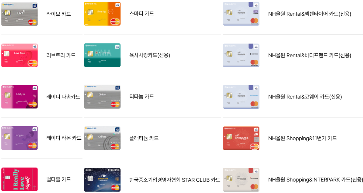 라이브카드/ 러브트리 카드/ 레이디 다솜카드/ 레이디 라온 카드/ 별다줄 카드/ 스마티 카드/ 육사사랑카드/ 티타늄 카드/ 플래티늄 카드/ 한국중소기업경영자협회STAR CLUB 카드/ NH올원 rental&넥센타이어 카드/ NH올원 rental&바디프랜드 카드/ NH올원 rental&코웨 카드/ NH올원 shopping&11번가 카드/ NH올원 shopping&interpartk 카드