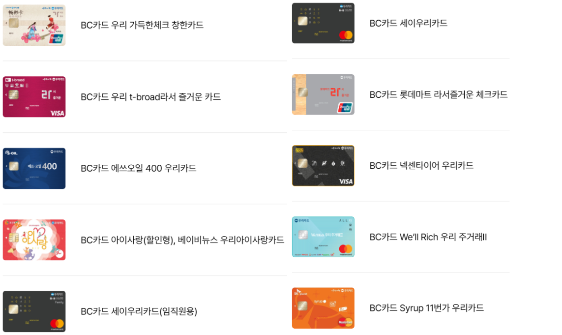 BC카드 우리 주거래(다모아포인트)컴퍼니아이디카드/ BC카드 우리 이랜드파크 체크카드/ BC카드 우리 가득한체크 창한카드/ BC카드 우리 t-broad라서 즐거운 카드/ BC카드 에쓰오일 400우리카드/ BC카드 아이사랑(할인형), 베이비뉴스 우리아이사랑카드/ BC카드 세이우리카드(임직원용)/ BC카드 세이우리카드/ BC카드 롯데마트 라서즐거운 체크카드/ BC카드 넥센타이어 우리카드/ BC카드 We'll Rich 우리 주거래II/ BC카드 syrup 11번가 우리카드