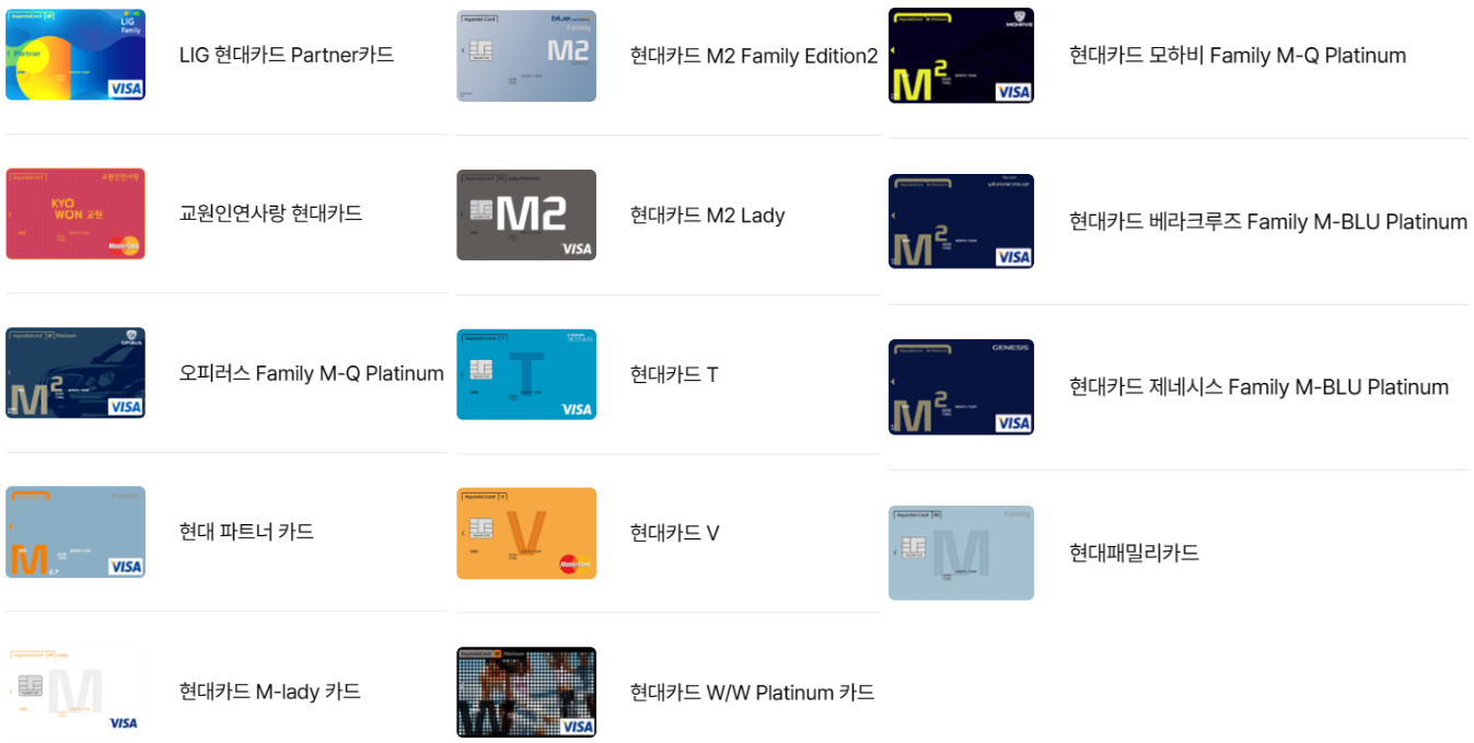 LIG현대카드 Partner카드/ 교원인연사랑 현대카드/ 오피러스 Family M-Q Platinum/ 현대 파트너 카드/ 현대카드 M-lady 카드/ 현대카드 M2 Family Edition2/ 현대카드 M2 Lady/ 현대카드T/ 현대카드V/ 현대카드W/W Platinum카드/ 현대카드 모하비 Family M-Q Platinum/ 현대카드 베라크루즈 Family M-BLU Platinum/ 현대카드 제네시스 Family M-BLU Platinum/ 현대패밀리카드