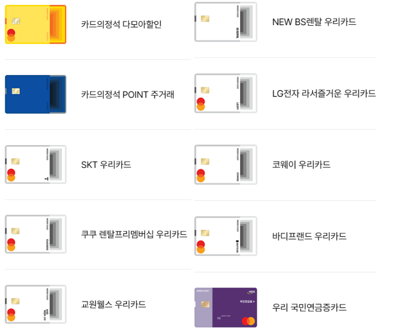카드의정석 다모아 할인/ 카드의정석 POINT 주거래/ SKT우리카드/ 쿠쿠 렌탈프리멤버십 우리카드/ 교원웰스 우리카드/ NEW BS렌탈 우리카드/ LG전자 라서즐거운 우리카드/ 코웨이 우리카드/ 바디프랜드 우리카드/우리 국민연금증카