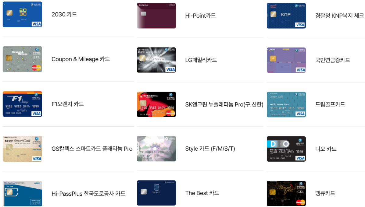 2030카드/ coupon&mileage 카드/ F1 오렌지 카드/ GS칼텍스 스마트카드 플래티늄Pro/ Hi-PassPlus 한국도로공사 카드/ Hi-point 카드/ LG패밀리카드/ SK엔크린 뉴플래티늄Pro(구.신한)/ Style카드(F/M/S/T)/ The Best 카드/ 경찰청 KNP복지 카드/ 국민연금증카드/ 드림골프카드/ 디오카드/ 땡큐카드