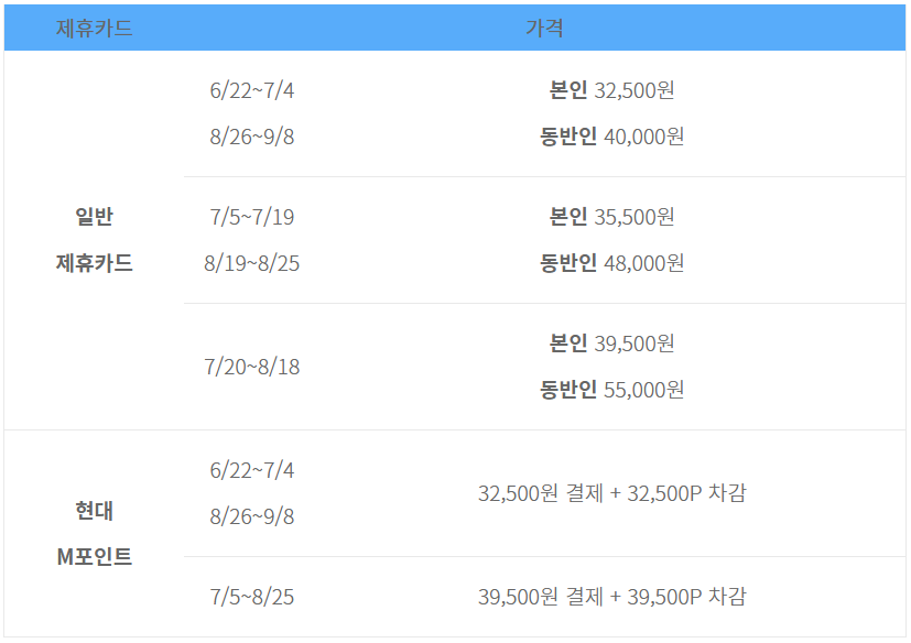 ■ 제휴카드 본인 및 동반인 할인 가격표(일반제휴카드, 현대M포인트)