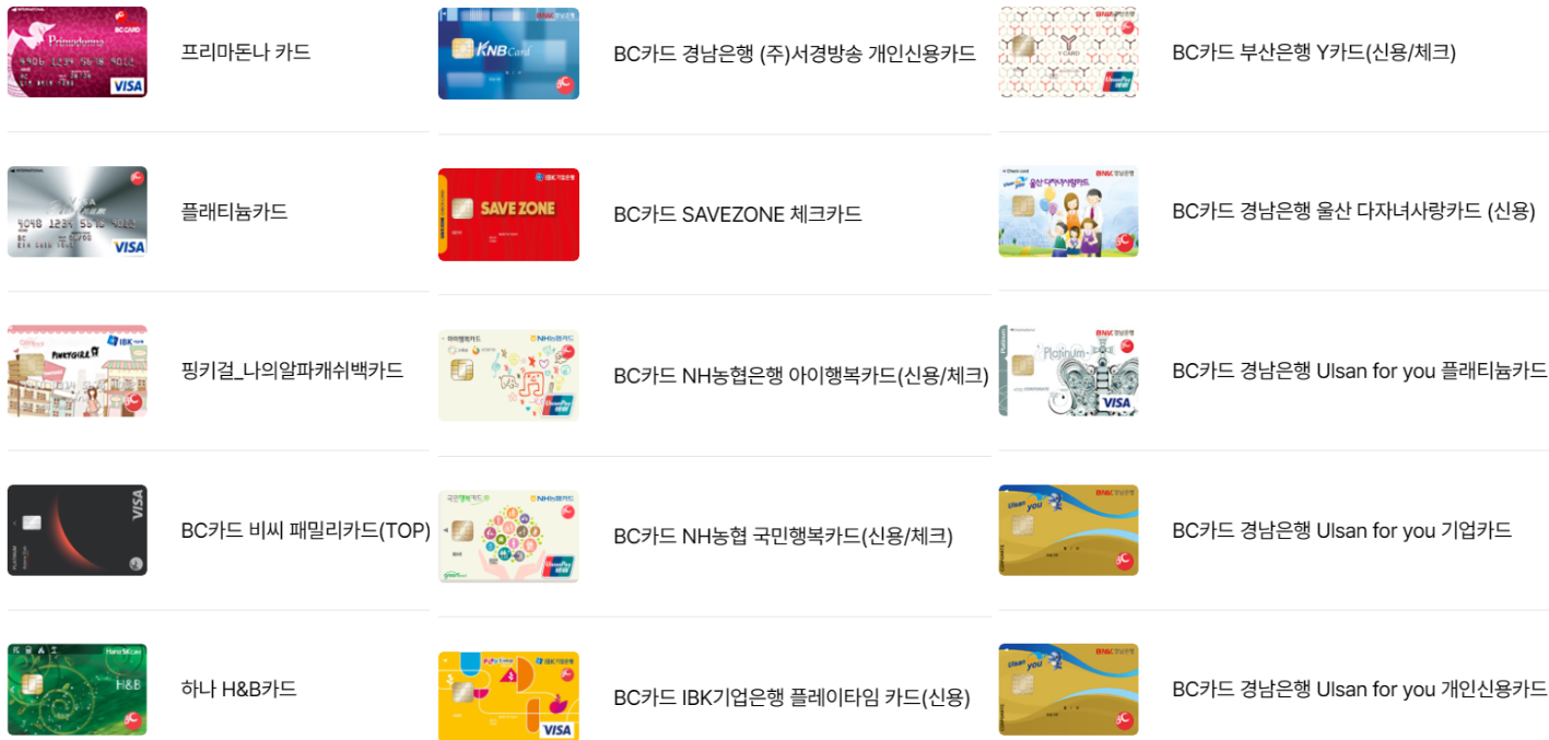 프리마돈나 카드/ 플래티늄 카드/ 핑키걸_나의알파캐쉬백카드/ BC카드 비씨 패밀리카드(TOP)/ 하나 H&B카드/ BC카드 경남은행 (주)서경방송 개인신용카드/ BC카드 SAVEZONE 체크카드/ BC카드 NH농협은행 아이행복카드(체크/신용)/ BC카드 NH농협 국민행복카드(신용/체크)/ BC카드 IBK기업은행 플레이타임 카드(신용)/ BC카드 부산은행 Y카드(신용/체크)/ BC카드 경남은행 울산 다자녀사랑카드(신용)/ BC카드 경남은행 Ulsan for you 플래티늄카드/ BC카드 경남은행 Ulsan for you 기업카드/ BC카드 경남은행 Ulsan for you 개인신용카드