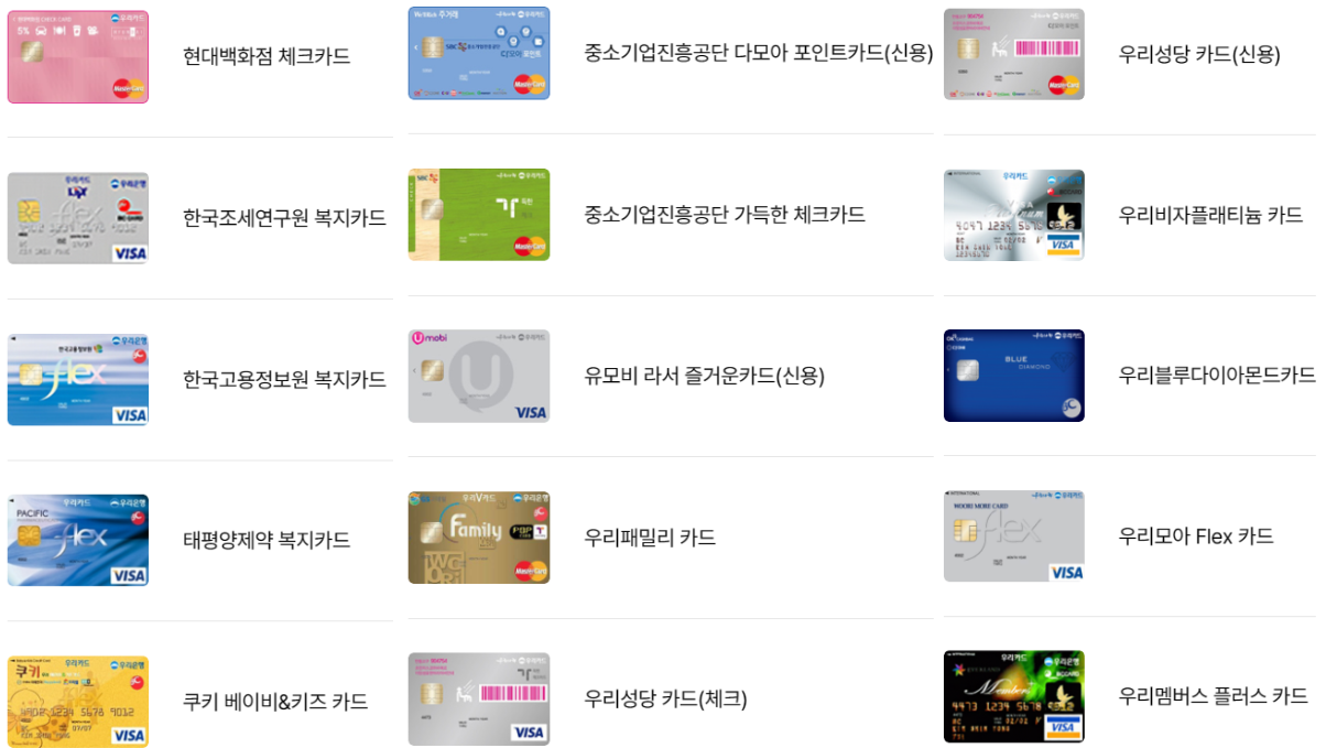 현대백화점 체크카드/ 한국조세연구원 복지카드/ 한국고용정보원 복지카드/ 태평양제약 복지카드/ 쿠키 베이비&키즈 카드/ 중소기업진흥공단 다모아 포인트카드/ 중소기업진흥공단 가득한 체크카드/ 유모비 라서 즐거운카드/ 우리패밀리 카드/ 우리성당카드(체크/신용)/ 우리비자플래티늄 카드/ 우리블루다이아몬드카드/ 우리오마 Flex카드/ 우리멤버스 플러스 카드