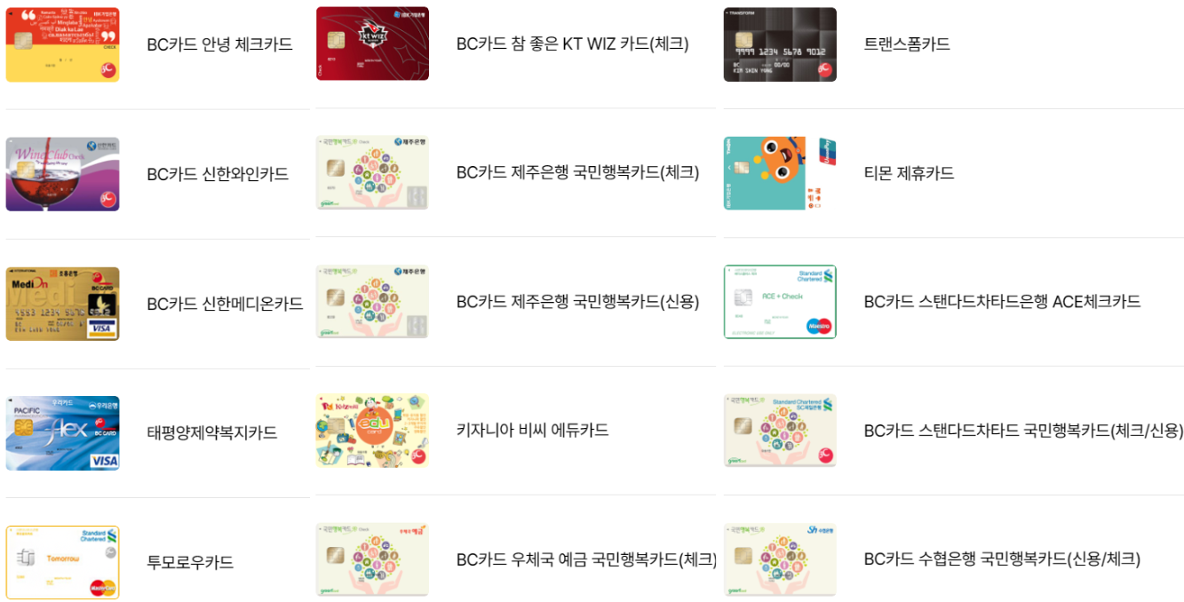 BC카드 안녕 체크카드/ BC카드 신한와인카드/ BC카드 신한메디온카드/ 태평양제약복지카드/ 투모로우카드/ BC카드 참 좋은 KT WIZ카드(체크)/ BC카드 제주은행 국민행복카드(체크/신용)/ 키자니아 비씨 에듀카드/ BC카드 우체국 예금 국민행복카드/ 트랜스폼카드/ 티몬 제휴카드/ BC카드_스탠다드차타드은행 ACE체크카드/ BC카드 스탠다드차타드 국민행복카드(체크/신용)/ BC카드 수협은행 국민행복카드(신용/체크)