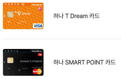 하나 플래티늄카드/ 하나비씨 아웃백 카드/ 하나 플래티늄 비자 카드/ 하나 착한카드/ 하나 에버랜드 카드/ 하나 빅팟카드/ 하나 매일 더블 캐쉬백 카드(체크카드 제외)/ 하나 내맘대로 카드/ 하나 기업 복지카드/ 하나 T Dream 카드/ 하나 SMART POINT카드
