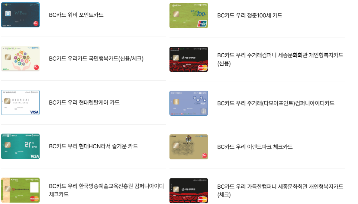 BC카드 위비 포인트카드/ BC카드 우리카드 국민행복카드(체크/신용)/ BC카드 우리 현대렌탈케어 카드/ BC카드 우리 현대HCN라서 즐거운 카드/ BC카드 우리 한국방송예술교육진흥원 컴퍼니아이디 체크카드/ BC카드 우리 청춘 100세 카드/ BC카드 우리 주거래컴퍼니 세종문화회관 개인형복지카드(체크/신용)