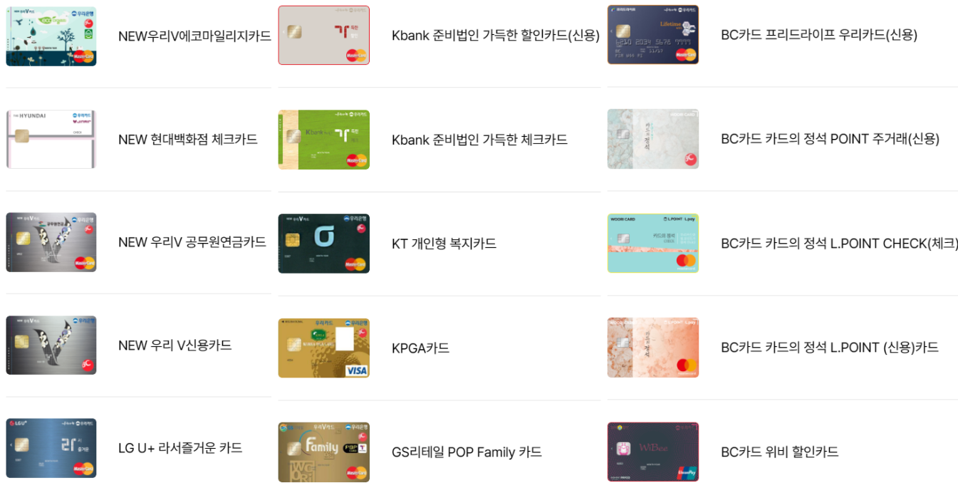 NEW우리V에코마일리지카드/NEW 현대백화점 체크카드/ NEW우리V공무원연금카드/ NEW우리 V신용카드/ LG U+라서즐거운 카드/ Kbank준비법인 가득한 할인카드/ Kbank준비법인 가득한 체크카드/ KT개인형 복지카드/ KPGA카드/ GS리테일POP Family카드/ BC카드 프리드라이프 우리카드/ BC카드 카드의 정석 POINT 주거래/ BC카드 카드의 정석 L.POINT CHECK/ BC카드 카드의 정석 L.POINT(신용)카드/ BC카드 위비 할인카드