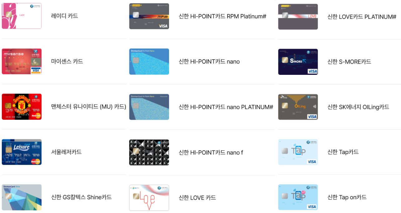 레이디 카드/ 마이센스 카드/ 맨체스터 유나이티드(MU)카드-체크카드제외/ 서울레저카드/ 신한GS칼텍스Shine카드/ 신한 Hi-point카드 PRM platiunm#/ 신한 Hi-point카드 nano PLATINUM#/ 신한 Hi-point카드 nano f/ 신한LOVE카드/ 신한LOVE카드 PLATINUM#/ 신한 S-MORE카드/ 신한 SK에너지 OILing카드/ 신한 Tap카드/ 신한 Tap on카드