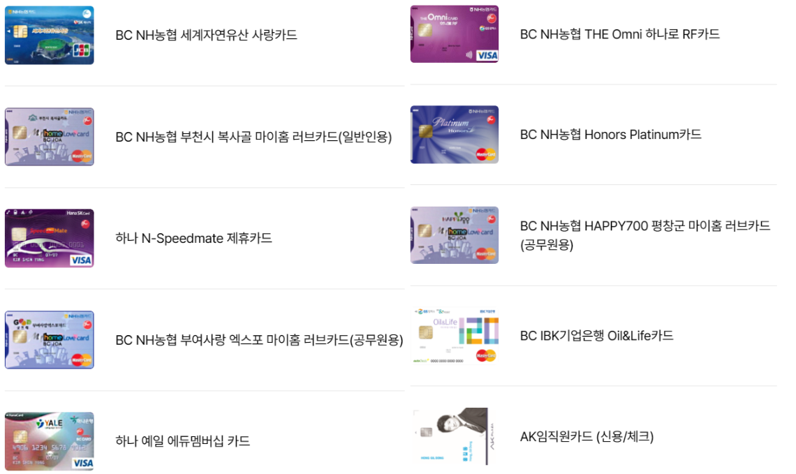 BC카드 NH농협 세계자연유산 사랑카드/ BC카드 NH농협 부천시 복사골 마이홈 러브카드(일반인용)/ 하나 N-Speedmate 제휴카드/ BC카드 NH농협 부여사장 엑스포 마이홈 러브카드(공무원용)/ 하나 예일 에듀멤버십 카드/ BC카드 NH농협  THE Omni 하나로 RF카드/ BC카드 NH농협  Honors Platinum카드/ BC카드 NH농협 HAPPU700 평창군 마이홈 러브카드(공무원용)/ BC IBK기업은행 Oil& Life카드/ AK임직원카드(신용/체크)
