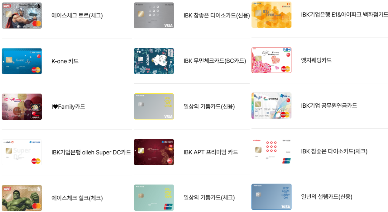 에이스체크 토르/ K-one 카드/ I♥Family카드/ 에이스체크 헐크(체크)/ IBK기업은행 olleh super DC카드/ IBK 참좋은 다이소카드(신용)/ IBK무민체크카드(BC카드)/ 일상의 기쁨카드(신용)/ IBK APT 프리미엄 카드/ 일상의 기쁨카드(체크)/ IBK 기업은행 E1&아이파크 백화점카드/ 엣지웨딩카드/ IBK기업 공무원연금카드/ IBK 참좋은 다이소카드(체크)/ 일년의 설렘카드