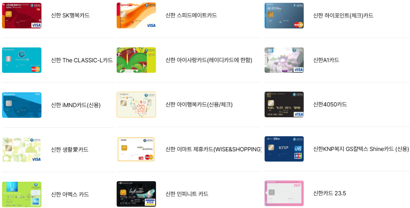 신한아침 愛카드/ 신한카드Big에너지(신용)/ 신한카드 MyShop/ 신한카드 MyShop Platinum#/ 신한 The lady classic(신용)/ 신한카드 홈플러스ONE/ 신한트래블보너스 Air Plus카드/ 신한플래티늄Pro카드(구.신한)/ 신한플래티늄카드(구.신한)/ 위키카드/ 이마트 wise&shopping discount 카드/ 자이 멤버스 신한 생활 愛카드/ 장애인복지카드/ 탑마드-신한카드/ 탑스파워 캠퍼스 플랜 체크카드/ 한국대학산악연맹 카드