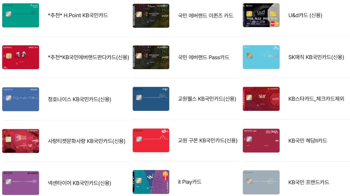 H.point KB국민카드/  KB국민메버랜드판다카드/ 청호나이스  KB국민카드/ 사랑티켓문화사랑  KB국민카드/ 넥센타이어  KB국민카드/  국민 에버랜드 이퀸즈 카드/ 국민 에버랜드 pass카드/ 교원웰스 KB국민카드/ 교원 구몬  KB국민카드/ it play 카드/ U&d카드/ SK매직  KB국민카드/  KB스타카드/  KB국민 혜담II카드/  KB국민 프랜드카드