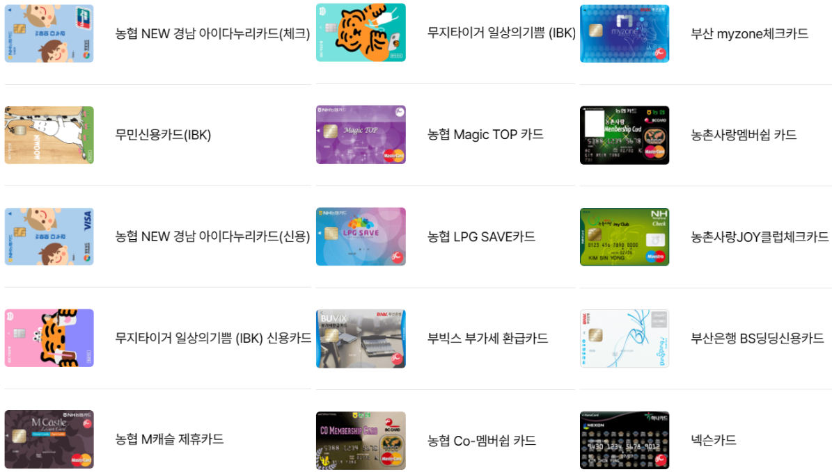 농협 NEW경남 아이다누리카드(체크/신용)/ 무민신용카드(IBK)/ 무지타이거 일상의기쁨(IBK)신용카드/ 농협 M캐슬 제휴카드/ 농협 Magic TOP카드/ 농협LPG SAVE카드/ 부빅스 부가세 환급카드/ 농협 Co-멤버쉽 카드/ 부산 myzone체크카드/ 농촌사랑멤버쉽카드/ 농촌사랑 JOY클럽체크카드/ 부산은행 BS딩딩신용카드/ 넥슨카드