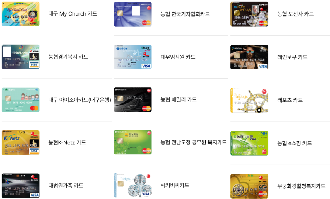 대구 My Church 카드/ 농협경기복지카드/ 대구 아이조아카드(대구은행)/ 농협K-netz카드/ 대법원가족 카드/ 농협 한구기자협회카드/ 대우임직원카드/ 농협패밀리카드/ 농협전남도청공무원복지카드/ 럭키비씨카드/ 농협 도선사 카드/ 레인보이 카드. 레포츠 카드/ 농협 e쇼핑 카드/ 무궁화경찰청복지카드.
