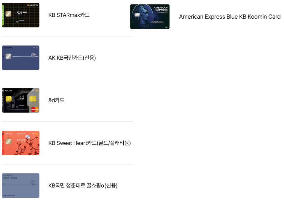 KB STARmaz카드/ AK  KB국민카드/ &d카드/ KB Sweet Heart카드(골드/플래티늄)/ KB국민 청춘대로 꿀쇼핑α/ Amnerican Express Blue KB Koomin card