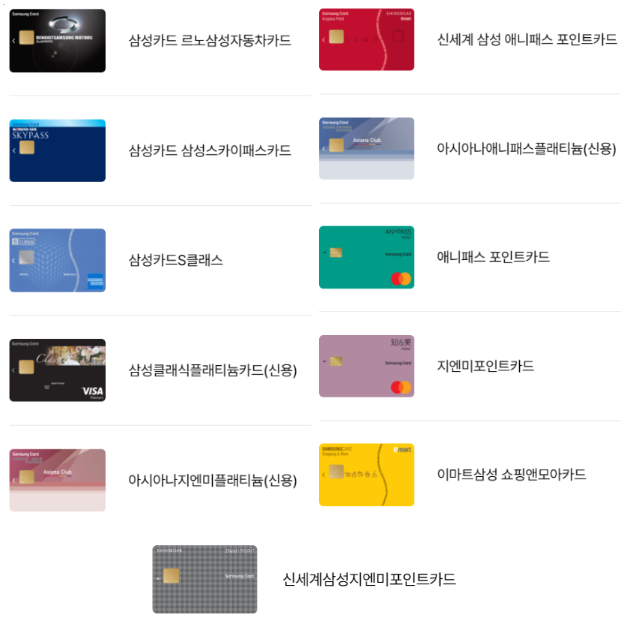 삼성카드 르노삼성자동차카드/ 삼성카드 삼성스카이패스카드/ 삼성카드 S클래스/ 삼성클래식플래티늄카드/ 아시아나지엔미플래티늄/ 신세계 삼성 애니패스 포인트카드/ 아시아나애니패스플래티늄/ 애니패스 포인트카드/ 제인미포인트카드/이마트삼성 쇼핑앤모아카/ 신세계삼성지엔미포인트카드
