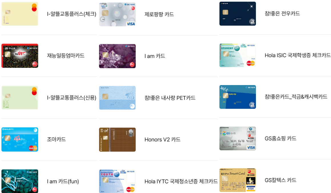 i-알뜰교통플러스(체크/신용)/ 조아카드/ i am카드/ 제로팡팡 카드/ 참 좋은 내사랑 PET카드/ Honors V2카드/ Hola IYTC국제청소년증 체크카드/ 참좋은 전우카드/ Hola ISIC 국제학생증 체크카드/ 참 좋은카드 적금&캐시백카드/ GS홈쇼핑 카드/ GS 칼텍스 카드