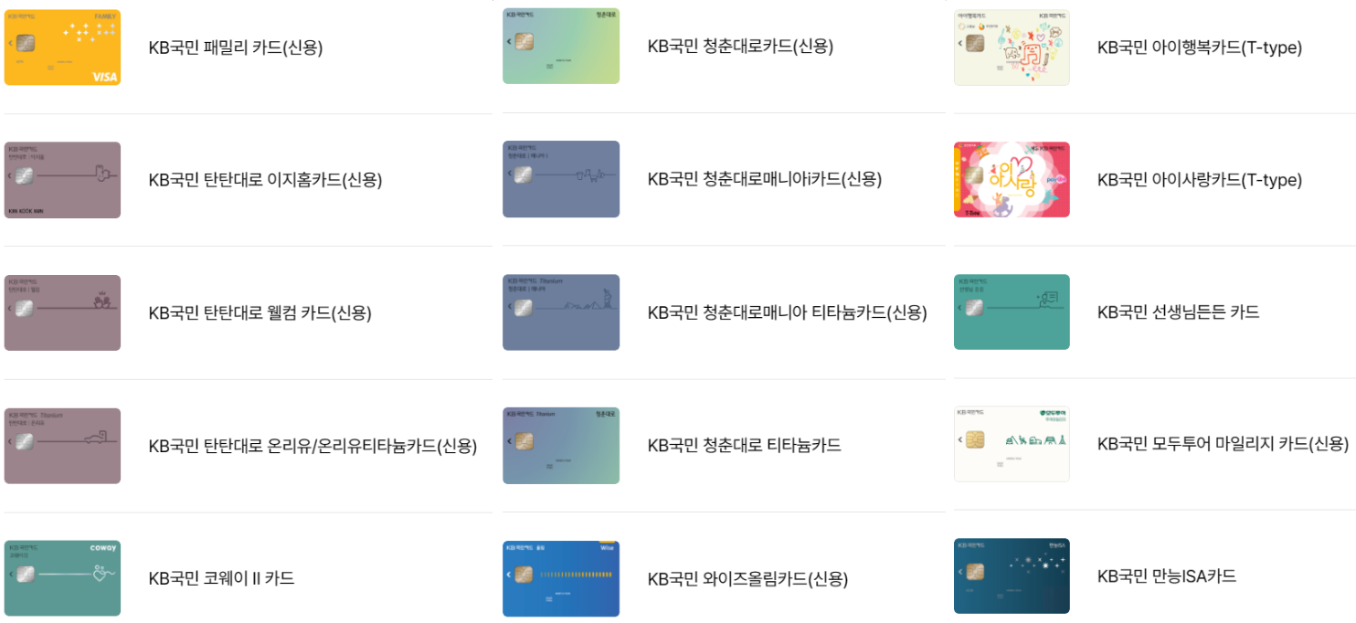 KB국민 패밀리 카드/  KB국민 탄탄대로 이지홈카드/  KB국민 탄탄대로 웰컴 카드/  KB국민 탄탄대로 온리유/ 온리유유티타늄카드/  KB국민 코웨이II카드/  KB국민 청춘대로카드/  KB국민 청춘대로매니아 티타늄카드/  KB국민 청춘대로 티타늄카드/  KB국민 와이즈올림카드/  KB국민 아이행복카드(T-type)/  KB국민 아이사랑카드(T-type)/  KB국민 선생님든든 카드/  KB국민 모두투어 마일리지 카드/  KB국민 만능ISA카드/