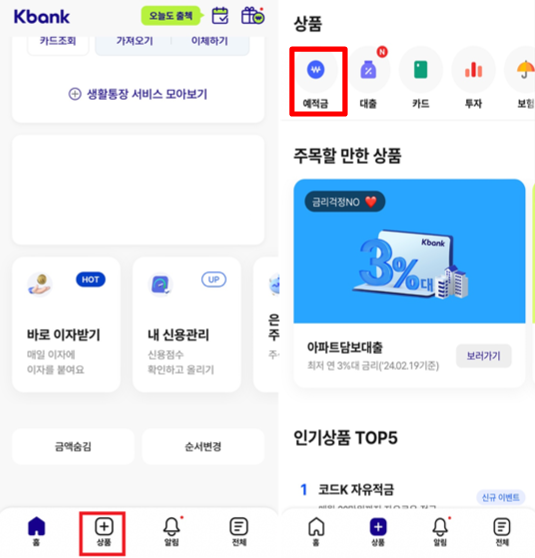 케이뱅크 앱 열기 → 하단 '상품' 클릭 → 예적금 메뉴 → 코드 K자유적금 클릭 → 발급받은 코드 넣고 가입