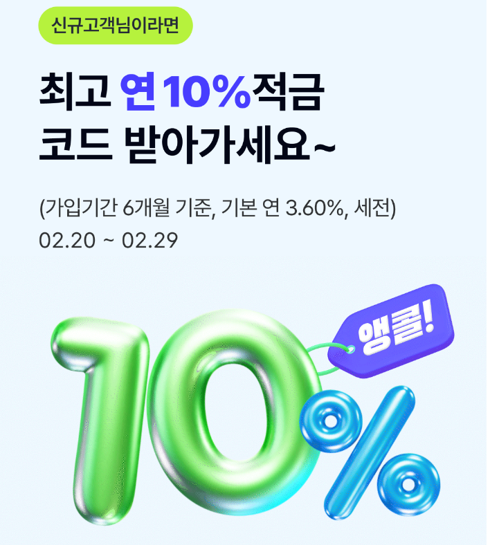 이벤트 적용금리 : 최고 연 10% (기본금리 연 3.6% + 우대금리 연 6.4%, 가입기간 6개월 고정, 세전)