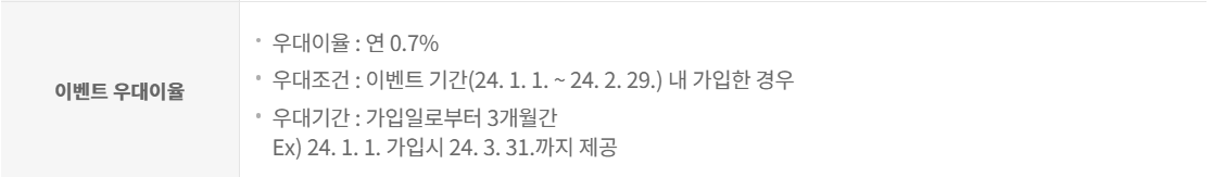※  우대금리 제공 기간: 계좌개설 전에 조건 충족 시 익월의 이자계산기간(익월 1일~말일)에 적용되고, 계좌개설 이후에 조건충족 시 익익월의 이자계산기간(익익월 1일~말일)에 적용됩니다.