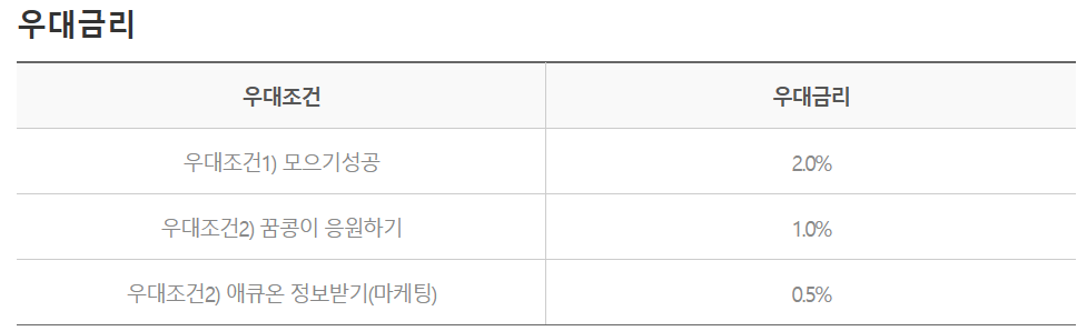 ※  조건1), 조건2)의 우대금리는 해당 월초일(또는 신규가입일)부터 말일까지의 조건충족여부를 확인하여 적용됩니다.