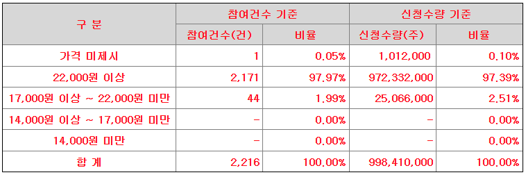 | 공모대상 | 주식수 | 배정비율 | 주당 공모가액 | 모집(매출)총액 | 비고 |