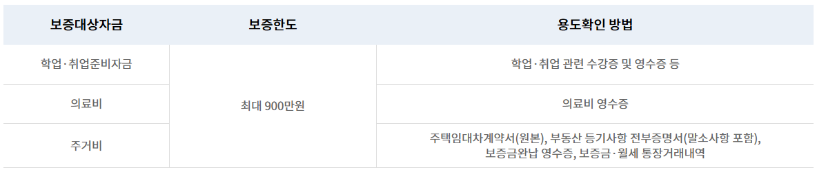 - 특정용도자금(학업, 의료비, 주거비)은 1년 내 최대 900만 원 한도 내에서 지원