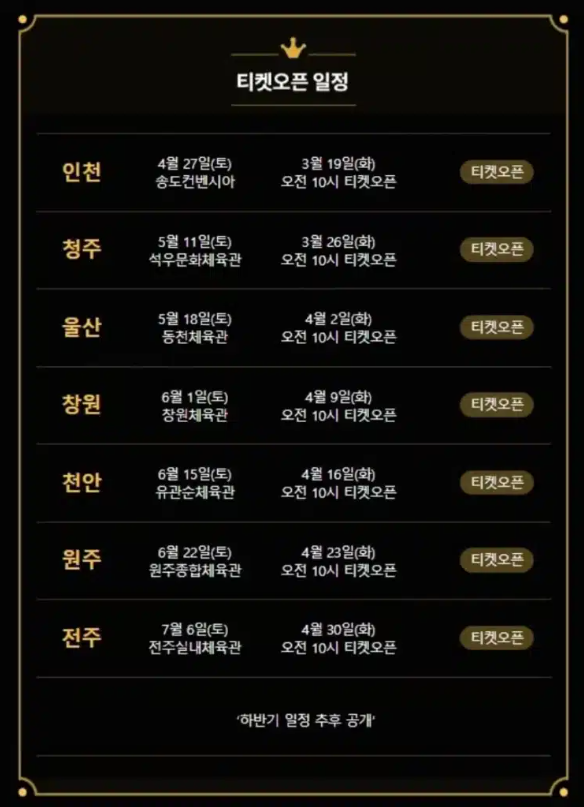 인천, 청주, 울산, 창원, 천안, 원주, 전주 순으로 진행되는 나훈아의 마지막 콘서트 일정 및 시간, 장소 확인.
